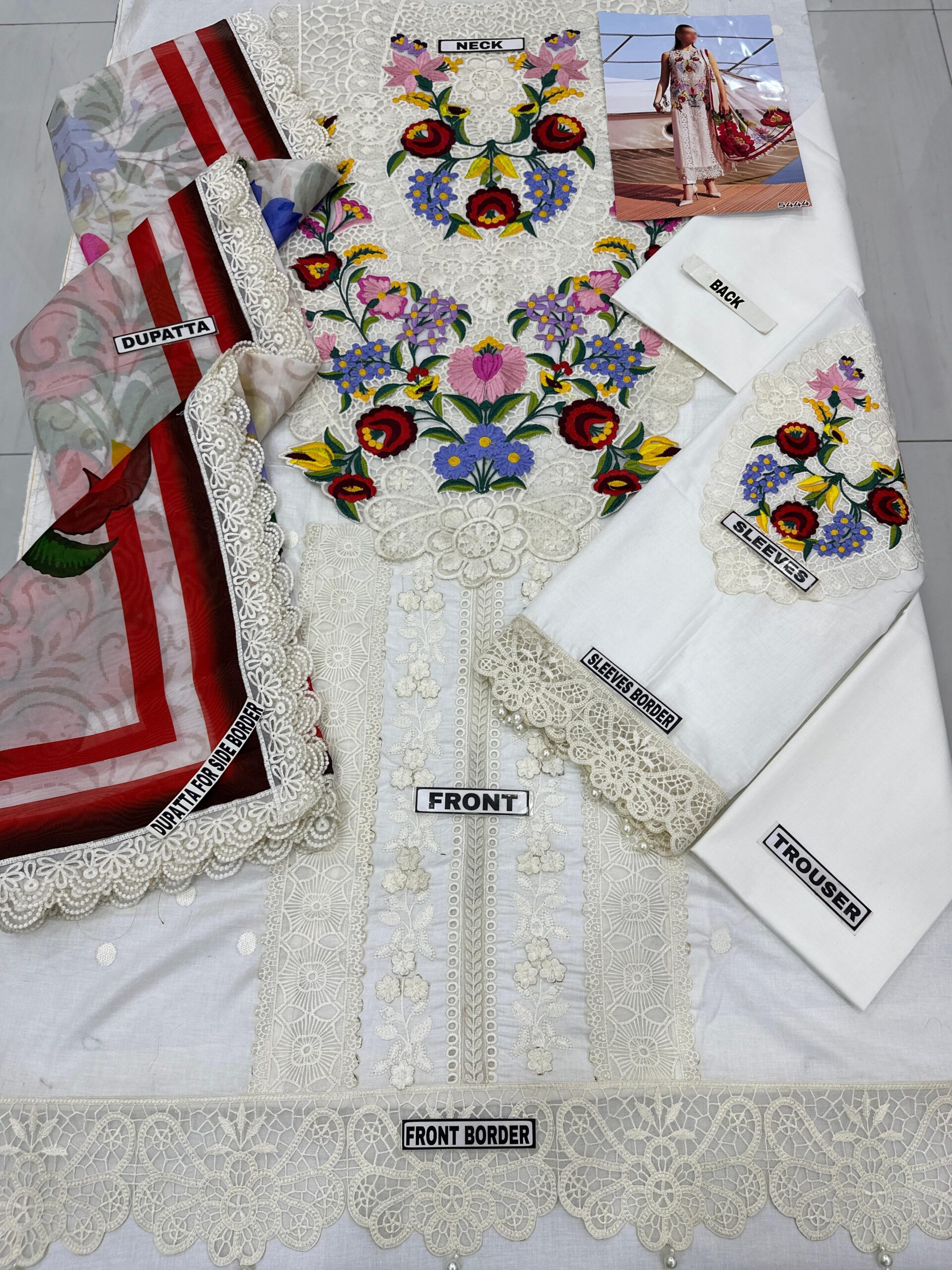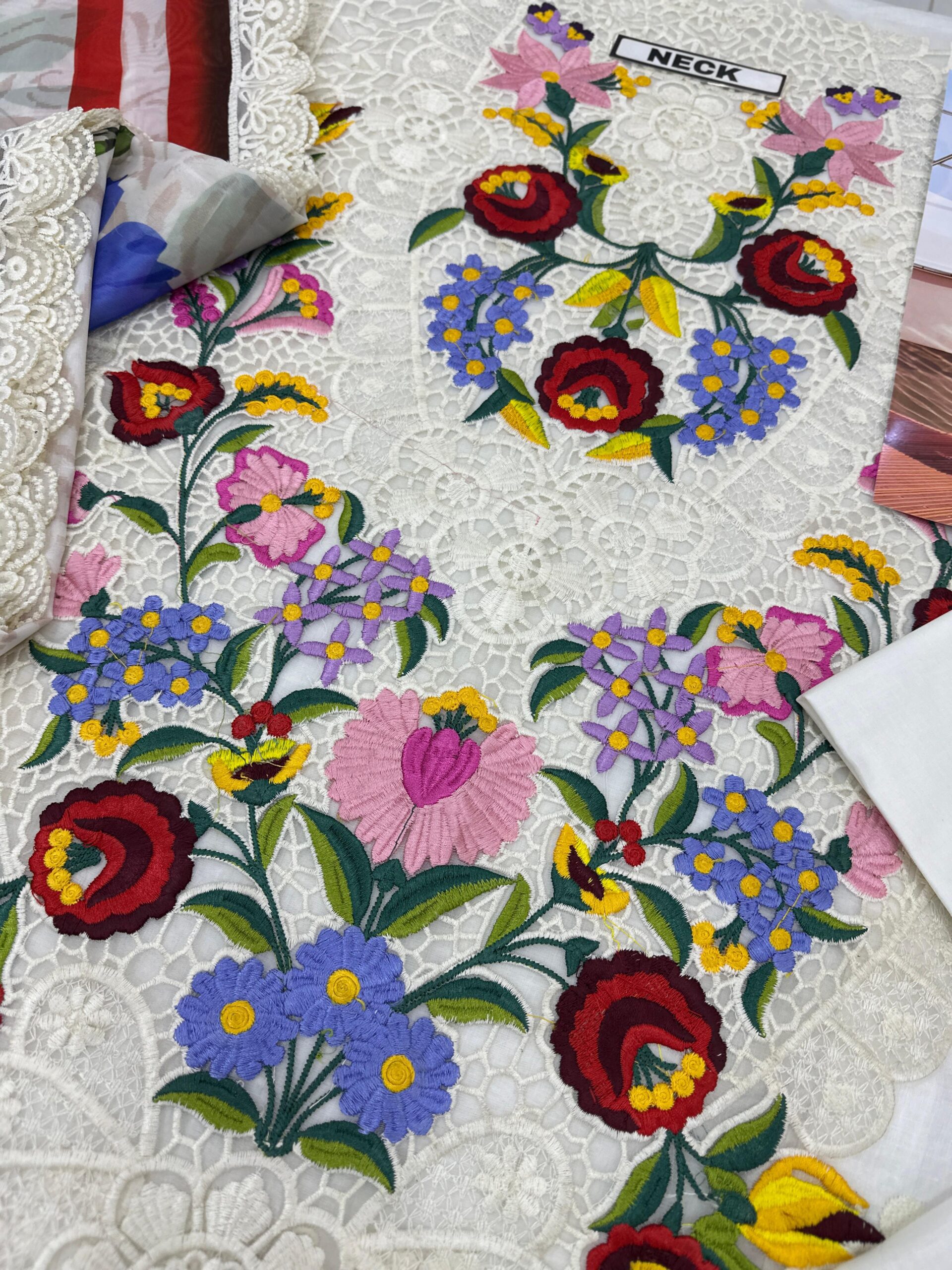 The front is fully embroidered with intricate cutwork, boring techniques, and refined 3D floral detailing, giving it a rich designer look. The neckline is beautifully enhanced with multi-tone thread embroidery using 9–10 vibrant colors, while the embroidered front border is finished with stylish hanging tassels.