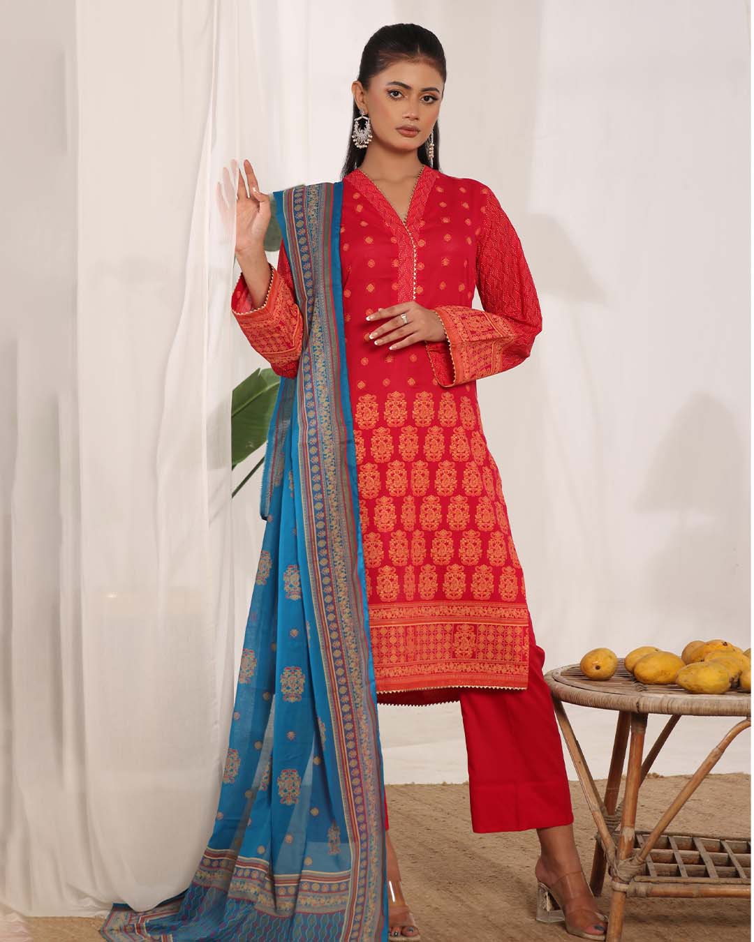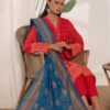 The outfit features a premium quality gold paste printed lawn shirt (front, back & sleeves) that gives a classy Banarsi-inspired appearance. It is paired with a premium dyed cambric trouser and a gold paste printed voile lawn dupatta, completing a graceful summer ensemble.