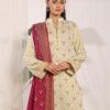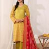 The outfit features a premium quality gold paste printed lawn shirt (front, back & sleeves) that gives a classy Banarsi-inspired appearance. It is paired with a premium dyed cambric trouser and a gold paste printed voile lawn dupatta, completing a graceful summer ensemble.